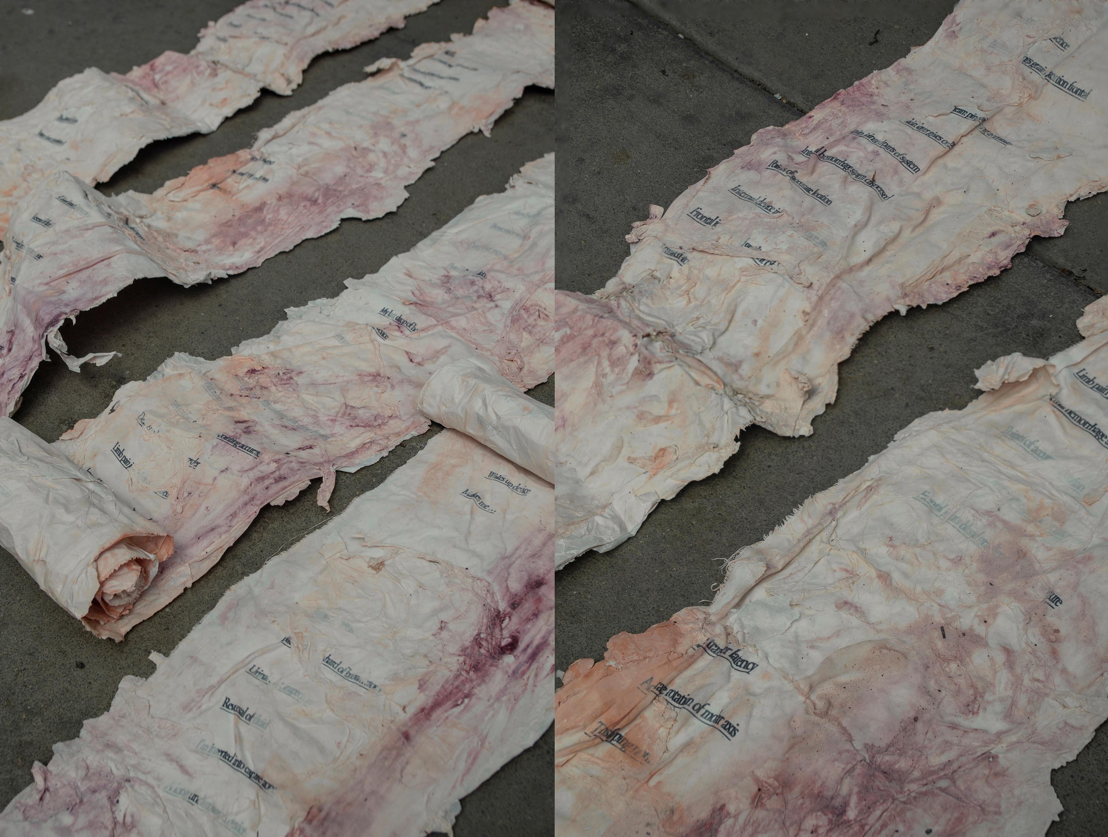 of text, here like βsubtitlesβ for the video piece, are repeated but obscured behind sedimented